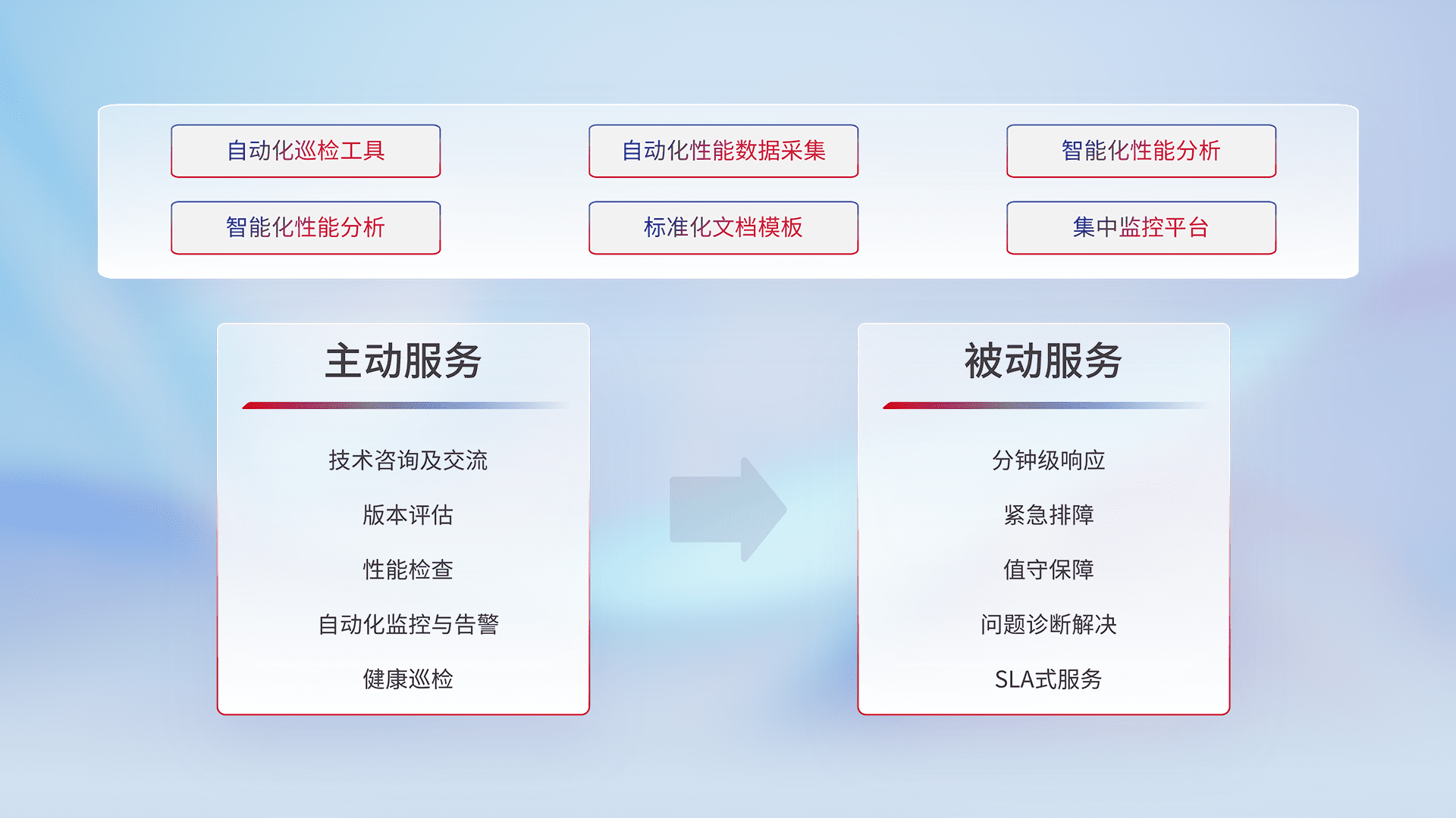 智能化工具和标准化文档,,,,保障服务质量,,,,提供主动服务(包含技术咨询、、、版本评估、、性能检查、、自动化监控与告警、、、健康巡检)和被动服务包含(分钟级响应、、、、紧急排障、、、、值守保障、、、问题诊断解决、、SLA服务)。。