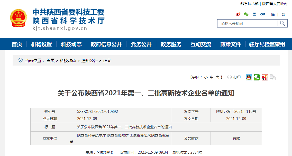 根据全国高新技术企业认定管理工作领导小组办公室《关于陕西省2021年第一批备案高新技术企业名单的函》(国科火字〔2021〕158号)、、《关于陕西省2021年第二批备案高新技术企业名单的函》(国科火字〔2021〕181号),,,,现将陕西省2021年第一、、、、二批高新技术企业予以公布。。。。